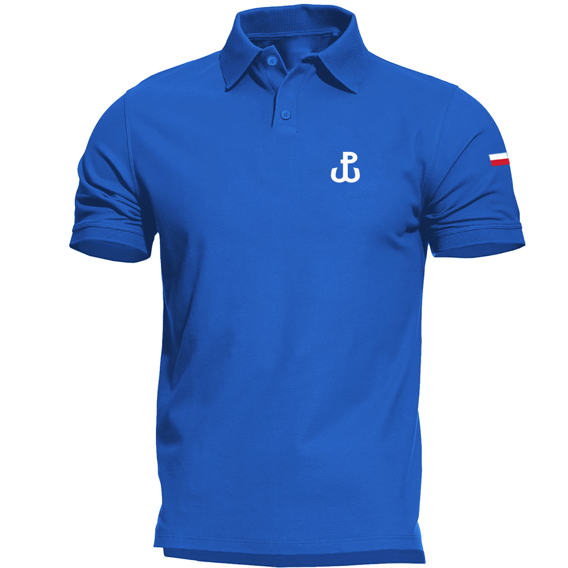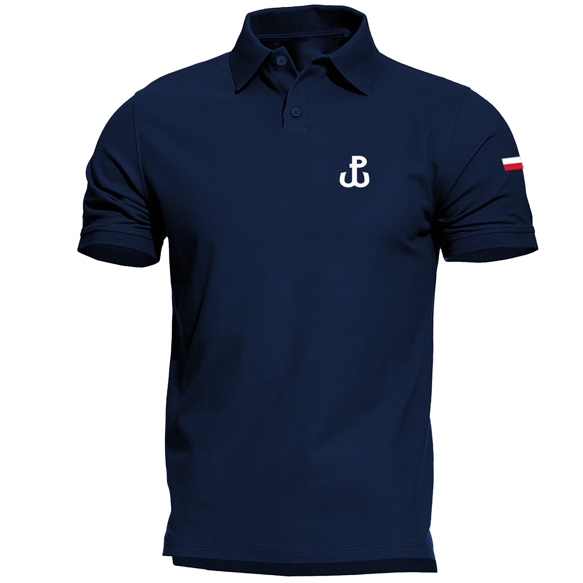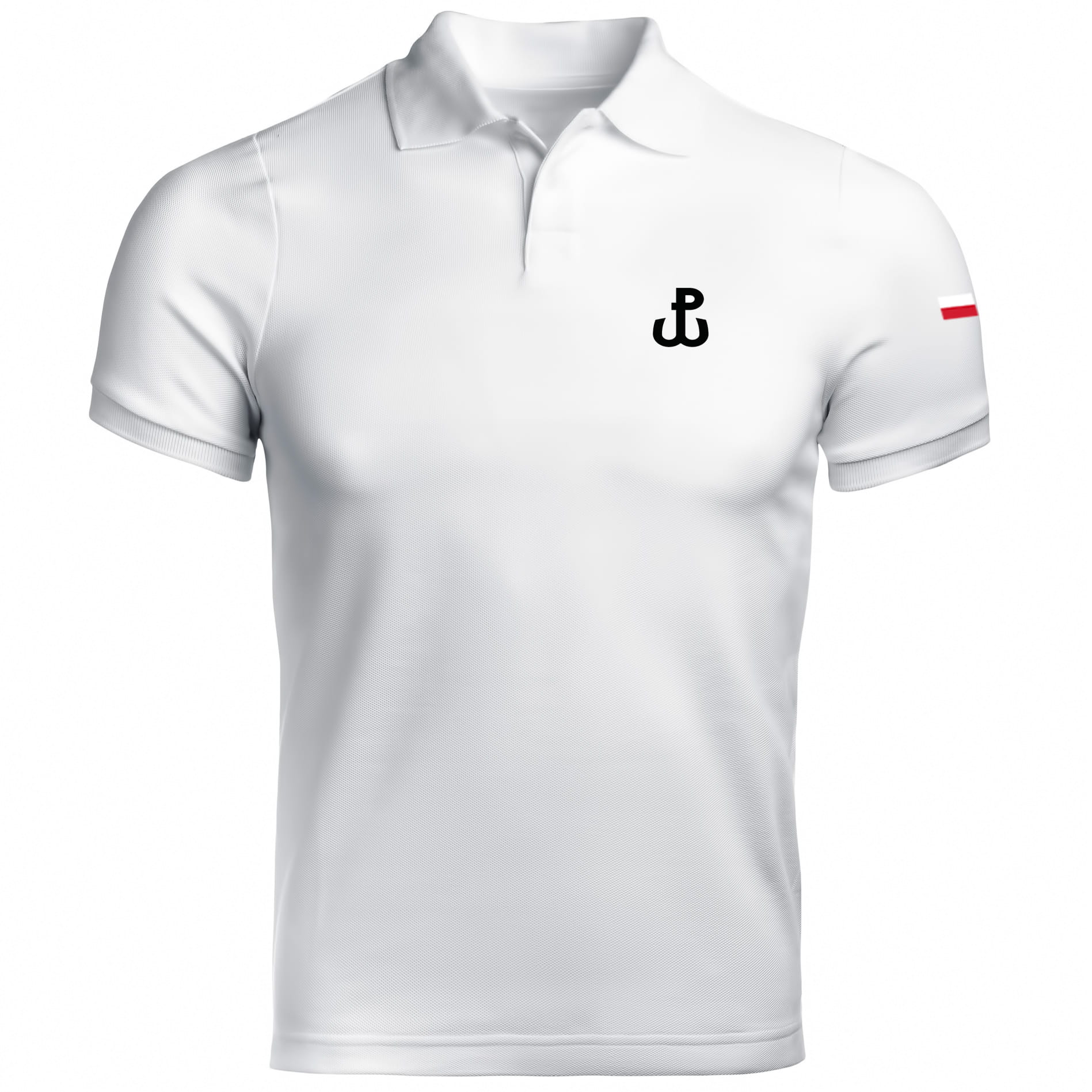 Na przedniej części polówki z serii odzieży patriotycznej – po lewej stronie na piersi znajduje się symbol Polski Walczącej. Natomiast na ramieniu znajduje się subtelna flaga Polski.